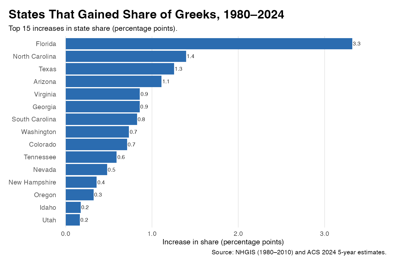 Figure 3. States that gained share of the U.S. Greek‑ancestry population, 1980–2024 (percentage‑point change).