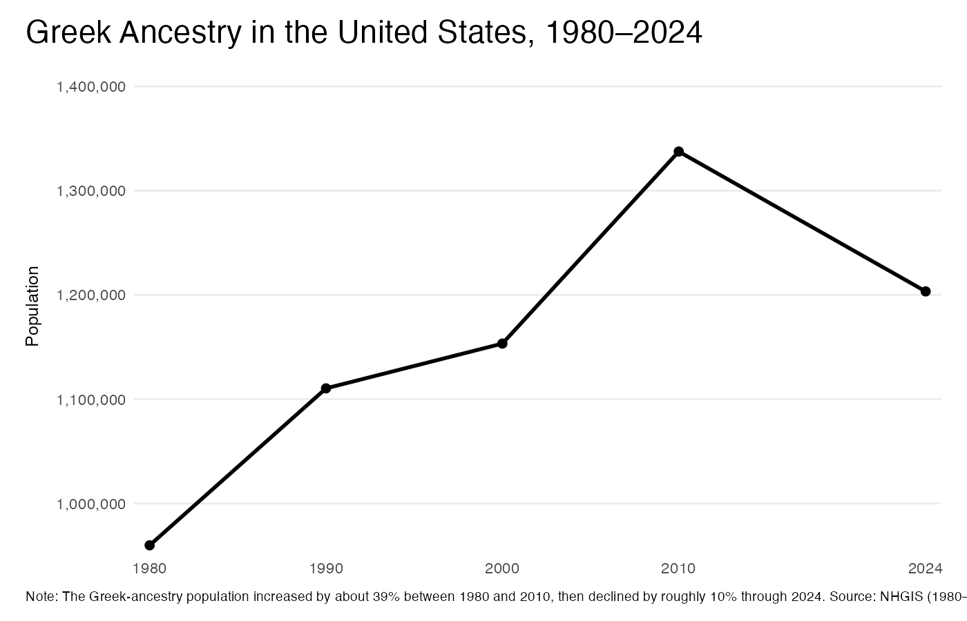 The national Greek‑ancestry population increased from 1980 through 2010, rising by about 39% (959,856 to 1,337,511). Since 2010, the total has declined by roughly 10%, to about 1,203,356 in the 2024 ACS 5‑year estimates. Overall, the long‑run pattern is three decades of growth followed by a more recent period of moderate decline (See Figure 1 below).