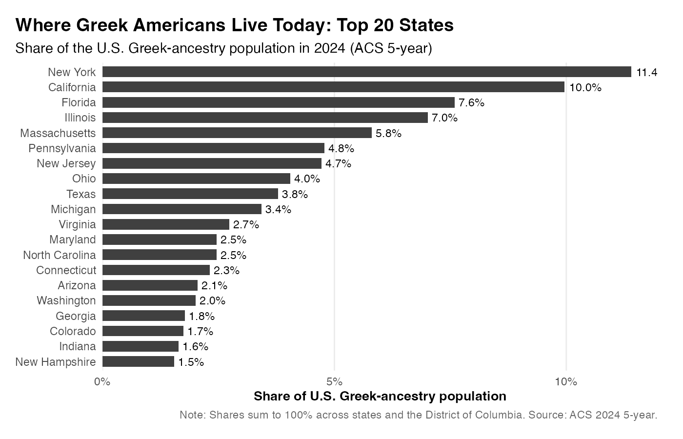 Figure 2. Where Greek Americans live today: Top 20 states by share of the U.S. Greek‑ancestry population (2024).