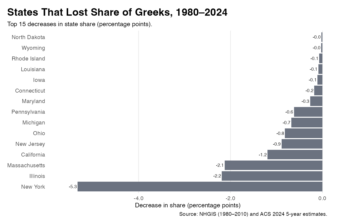 Figure 4. States that lost share of the U.S. Greek‑ancestry population, 1980–2024 (percentage‑point change).