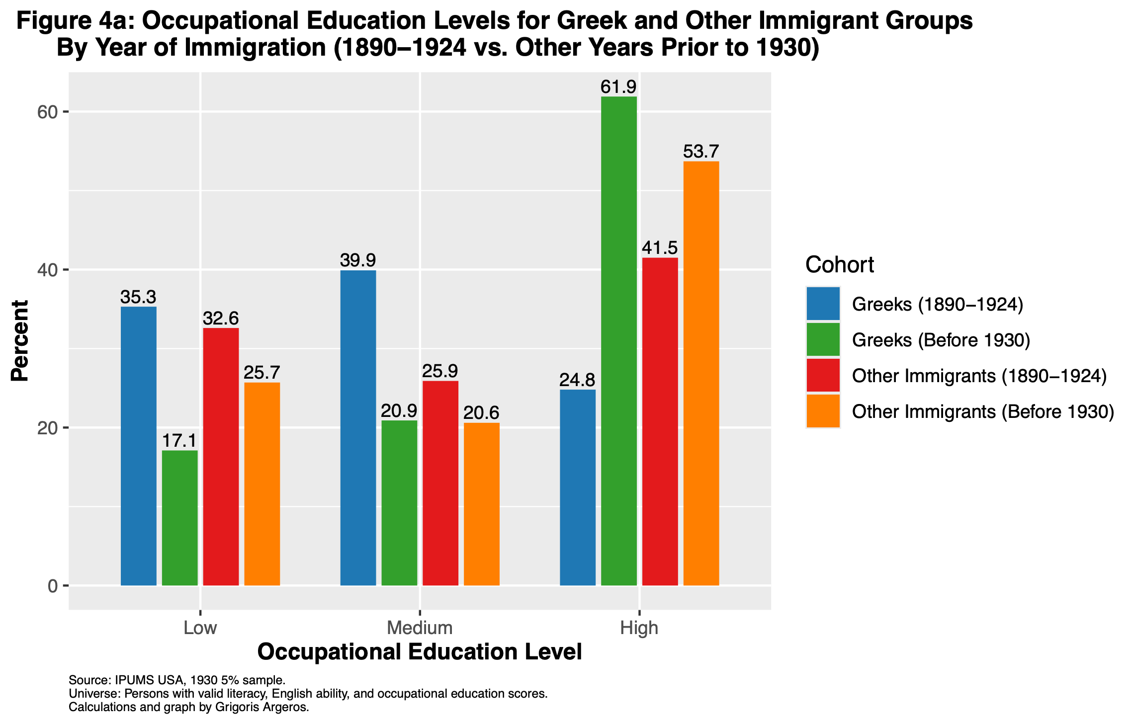 Figure 4a (below) shows how the occupational education levels differ by year of arrival for both Greek immigrants and other immigrant groups. For each group, the figure compares those who arrived during the 1890 - 1924 period with those who arrived in other years before 1930.