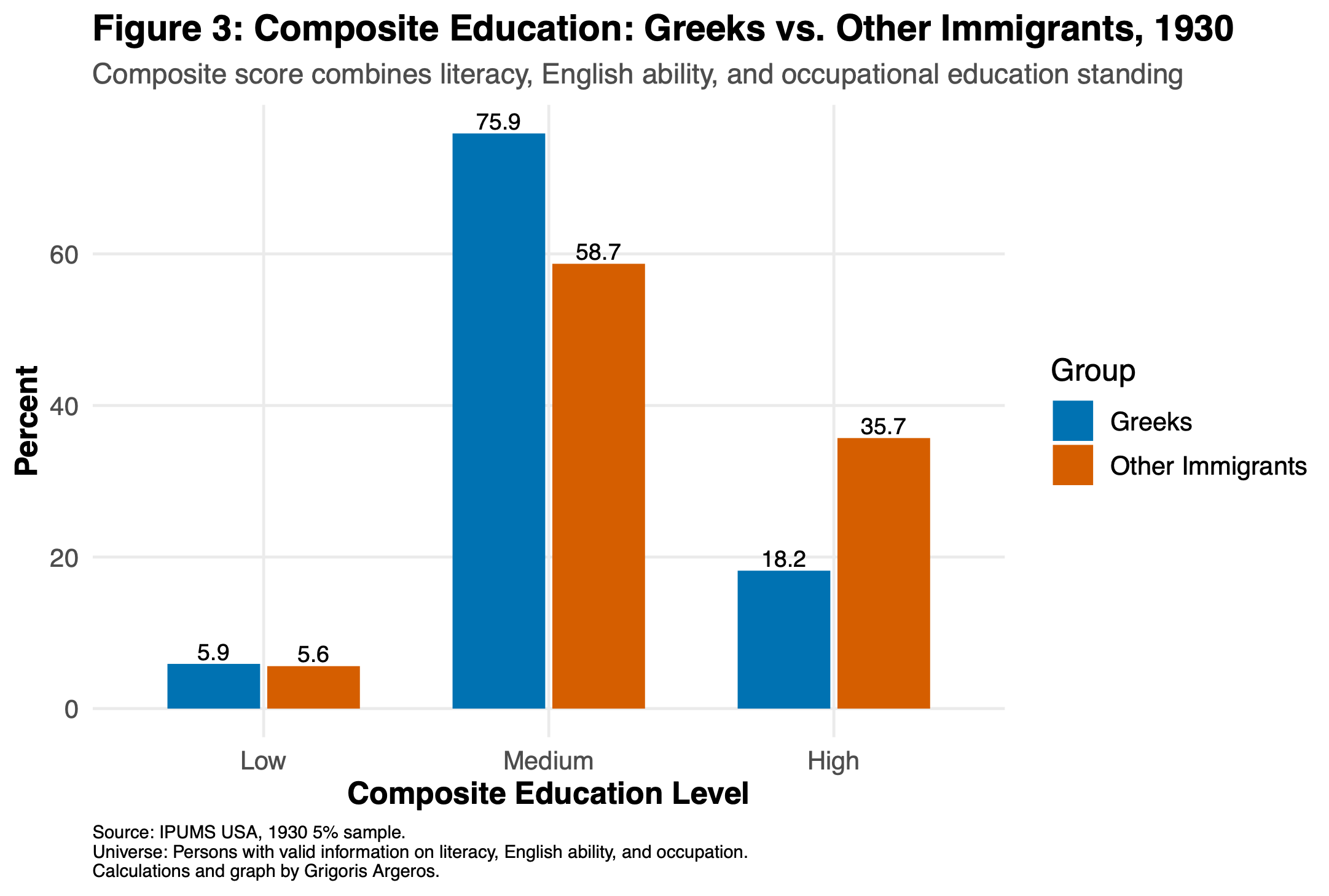 To get a broader picture of where Greek immigrants stood in the overall educational hierarchy in 1930, I created a composite score combining literacy, English-language ability, and the typical educational level associated with each occupation. This last indicator is shown and discussed in the previous graph.