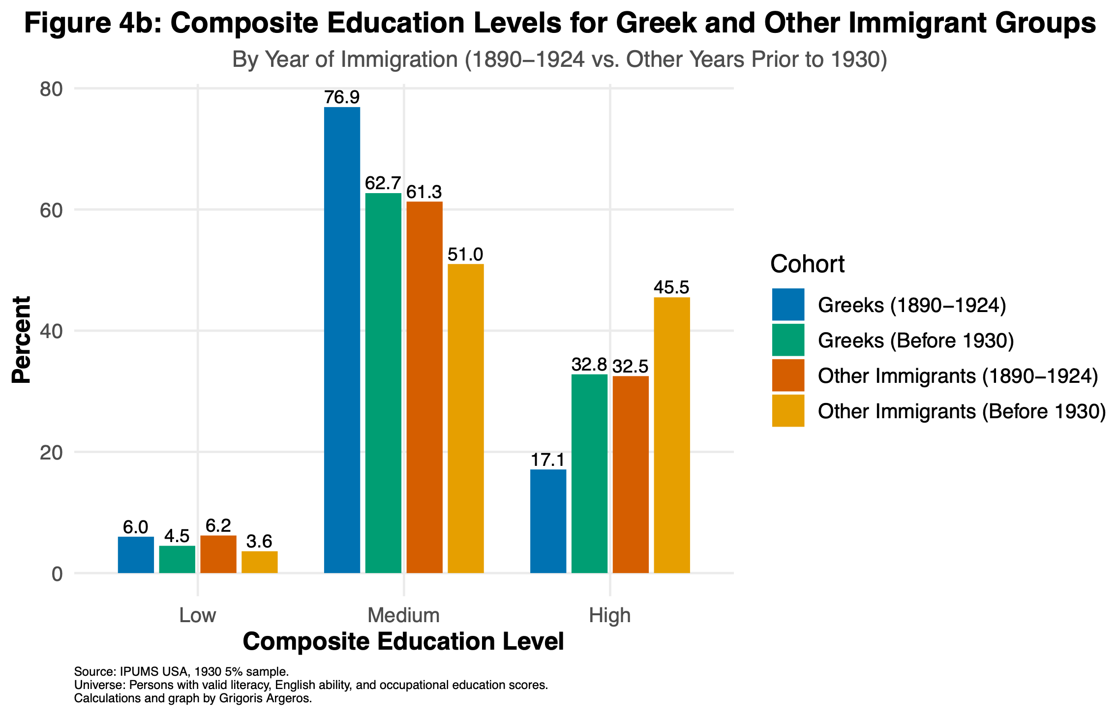 By comparison, Greeks who arrived in other years before 1930 have a different profile: they show a much larger share in the high composite tier and a smaller share in the low tier.